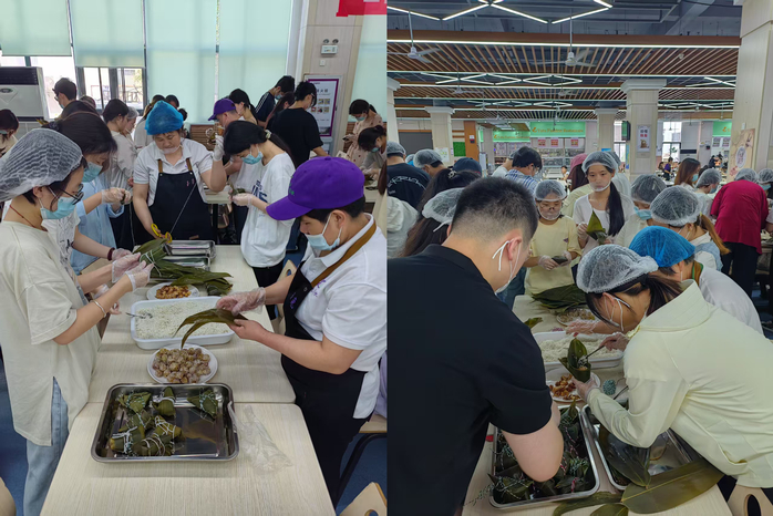 在學(xué)生處與后勤集團(tuán)的聯(lián)合組織下,“端午粽動(dòng)員 巧手制安康”包粽子體驗(yàn)活動(dòng)在第二學(xué)生食堂舉行。食堂精心準(zhǔn)備了粽葉、糯米、肉餡和蜜棗等材料,在師傅的悉心指導(dǎo)下,200多名學(xué)生踴躍參與,共包制了2000余個(gè)粽子。