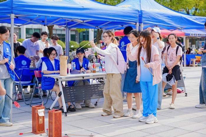 南艷茶舍以茶藝文化浸潤人心,手工舍展出手工藝品制作技藝,科創(chuàng)星辰舍呈現(xiàn)科技創(chuàng)新成果……各社團(tuán)通過實(shí)物展示與互動體驗(yàn),立體化展現(xiàn)校園多元文化魅力。青年服務(wù)中心特設(shè)減壓游戲區(qū),以輕松有趣的互動拉近社團(tuán)與學(xué)生的距離。
