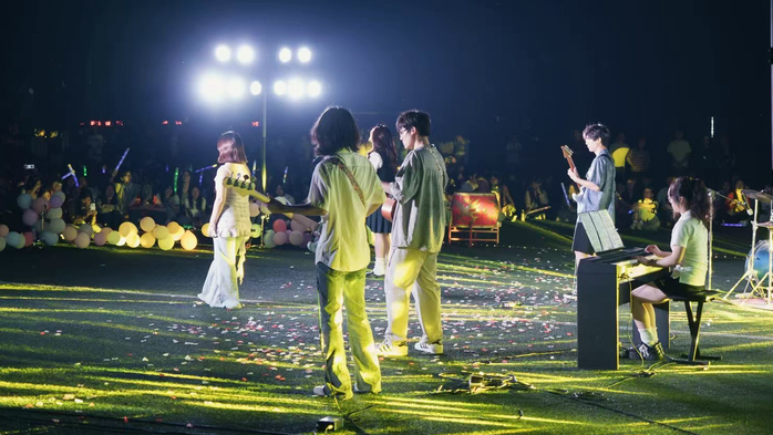 隨著第一縷吉他聲響起,音樂節(jié)在歡呼聲中拉開帷幕。流行搖滾、民謠彈唱、阿卡貝拉等多元音樂形式輪番登場。學(xué)生樂隊(duì)的原創(chuàng)曲目《夏日來信》用動感節(jié)奏點(diǎn)燃全場,師生合唱的《夜空中最亮的星》,溫柔旋律中閃爍著溫暖共鳴。數(shù)千名觀眾手持熒光棒,隨音樂節(jié)奏揮舞出層層“光浪”,將現(xiàn)場氣氛推向高潮。當(dāng)壓軸曲目《明天會更好》響起,細(xì)碎的光斑與空中紙花交織,為這場音樂聚會畫上句點(diǎn)。
