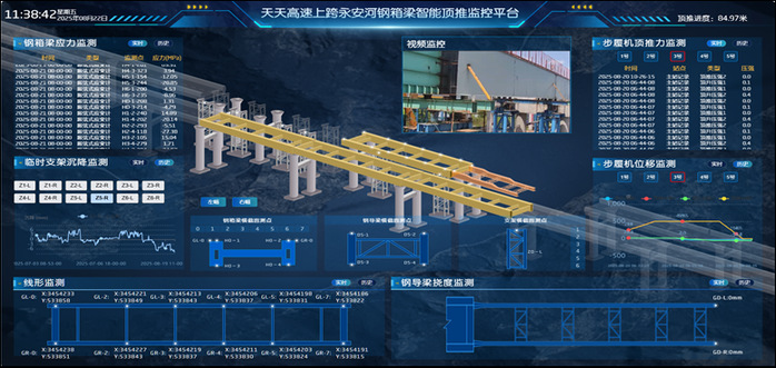 該智能頂推安全監(jiān)控系統(tǒng)平臺是由合肥大學(xué)完全自主研發(fā)的在線監(jiān)測系統(tǒng),以結(jié)構(gòu)安全和施工過程預(yù)警為導(dǎo)向,深度融合了物聯(lián)網(wǎng)、大數(shù)據(jù)、云/邊緣計算、人工智能以及數(shù)字孿生等先進(jìn)理念,可廣泛應(yīng)用于橋梁、房屋、隧道、邊坡等結(jié)構(gòu)安全在線監(jiān)測與健康管理。該系統(tǒng)利用云平臺共享技術(shù),通過預(yù)設(shè)無線傳輸設(shè)備模塊,實現(xiàn)了監(jiān)測數(shù)據(jù)融合、三維施工模擬、參數(shù)閾值預(yù)警等多項功能。為了應(yīng)對本次施工安全需求,研究團(tuán)隊等對智能監(jiān)控平臺進(jìn)行了定制化模塊開發(fā),包括鋼箱梁、臨時支架、鋼導(dǎo)梁、步履機(jī)施工過程參數(shù)及現(xiàn)場視頻信息傳輸?shù)饶K建設(shè)。結(jié)合無線傳輸和實時數(shù)據(jù)采集技術(shù),實現(xiàn)了鋼箱梁頂推過程中主要參數(shù)的實時監(jiān)測。經(jīng)過2個多月的現(xiàn)場實踐,智能監(jiān)控系統(tǒng)實時完整記錄并分析了施工階段各項關(guān)鍵參數(shù),為類似橋梁安全施工提供了可靠的數(shù)字化監(jiān)測平臺。