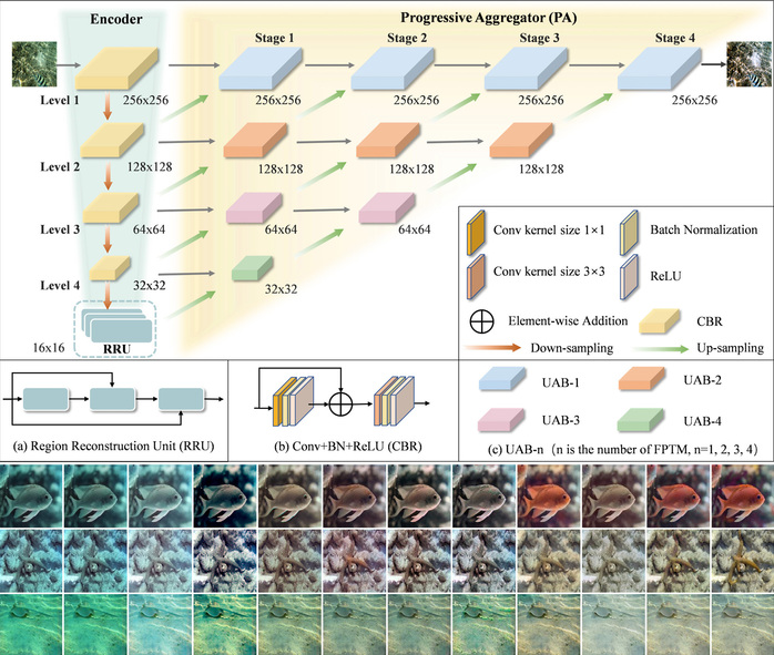 在水下圖像增強(qiáng)方向,研究團(tuán)隊(duì)提出一種融合特征提示Transformer的漸進(jìn)式聚合增強(qiáng)方法。該方法創(chuàng)新性地融合了特征注意力機(jī)制與提示權(quán)重調(diào)節(jié)輸入特征,實(shí)現(xiàn)了特征高效傳遞與多尺度漸進(jìn)式聚合,可以全面捕捉圖像細(xì)節(jié)與語(yǔ)義信息以有效增強(qiáng)水下降質(zhì)圖像。該方法展現(xiàn)出優(yōu)異的學(xué)習(xí)與泛化能力,且能為下游視覺任務(wù)帶來顯著性能增益。楊靜博士為第一作者和通訊作者,合肥大學(xué)人工智能與大數(shù)據(jù)學(xué)院為第一完成單位。(論文標(biāo)題:PAFPT: Progressive aggregator with feature prompted transformer for underwater image enhancement,引用鏈接:https://www.sciencedirect.com/science/article/pii/S0957417424024060