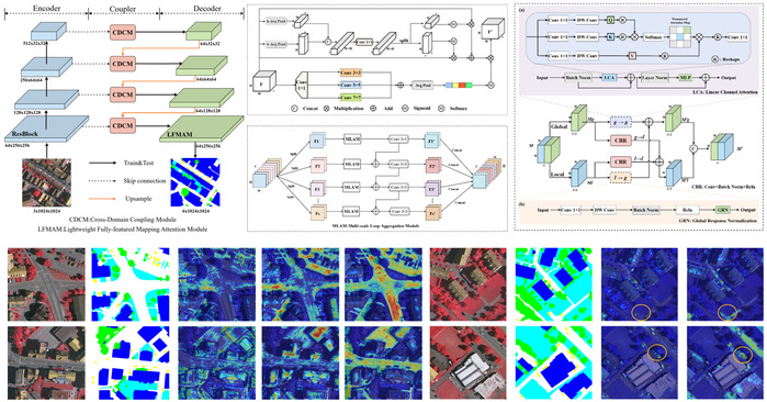 在復(fù)雜場(chǎng)景遙感語(yǔ)義分割方向,團(tuán)隊(duì)提出輕量級(jí)跨域耦合網(wǎng)絡(luò)(LCCN)。該網(wǎng)絡(luò)創(chuàng)新性采用“Encoder-Coupler-Decoder”架構(gòu),耦合器中通過跨域耦合模塊實(shí)現(xiàn)多尺度特征提取與全局信息建模,解碼器中借助輕量級(jí)全特征映射注意力模塊捕捉多維度特征交互,優(yōu)化復(fù)雜場(chǎng)景下的語(yǔ)義分割效果。王曉峰教授為第一作者,陳巖博士為通訊作者,合肥大學(xué)人工智能與大數(shù)據(jù)學(xué)院為第一完成單位。(論文標(biāo)題:Cross-Domain Coupling Network With Lightweight Fully Featured Mapping and Loop Aggregation for Semantic Segmentation of High-Resolution Remote Sensing Images,引用鏈接:https://ieeexplore.ieee.org/document/11129080)