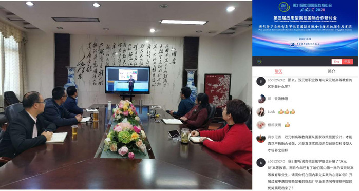 本次研討會(huì)邀請(qǐng)了8位國(guó)內(nèi)外應(yīng)用型高校及機(jī)構(gòu)的校領(lǐng)導(dǎo)、專(zhuān)家學(xué)者分別圍繞會(huì)議主題作了主旨報(bào)告,共同研討應(yīng)用型高校如何應(yīng)對(duì)全球疫情對(duì)教育國(guó)際合作產(chǎn)生的深遠(yuǎn)影響,探討后疫情時(shí)代應(yīng)用型人才培養(yǎng)的新思路與新模式,為推動(dòng)國(guó)際化應(yīng)用型人才培養(yǎng)質(zhì)量提升提供有益借鑒。與會(huì)發(fā)言人與線上參會(huì)人員進(jìn)行了討論與互動(dòng)。中外專(zhuān)家與參會(huì)人員突破了障礙相聚云端,共同探討應(yīng)用型高校建設(shè)和發(fā)展。
