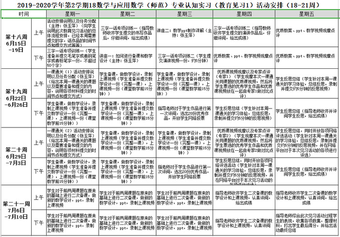 受教育研習成功經驗的鼓舞,數學與統(tǒng)計系再接再厲,在教務處和人工智能與大數據學院領導的關心和支持下,在數學與統(tǒng)計系王磊主任的帶領下,秉承“學生中心、產出導向”的原則,經過反復調研,積極籌備,為2018級數學專業(yè)74名師范生量身制定了為其四周的線上教育見習實訓(6月15日-7月10日)。此次活動形式創(chuàng)新、內容豐富,包括“線上書寫比賽”“線上演講比賽”“一周一課、課課通關”“專家課例點評”“教研見習反思”“第十一屆安徽省師范生技能大賽十強集訓”等系列活動。在教育見習過程中,邀請了合肥一中劉娟、胡媛媛,合肥六中徐小松,合肥一六八中學黃小娟、張玉萍等知名中學的5位一線教師和合肥市教育局的許曉天、張永超等數學教研員。他們充分參與了學生教學視頻的觀摩與評改,專業(yè)的線上教學評價講座等活動,充分踐行了《中學教育專業(yè)認證》中強調的“高校,地方政府,中學”三位一體、協(xié)同育人的新形式。