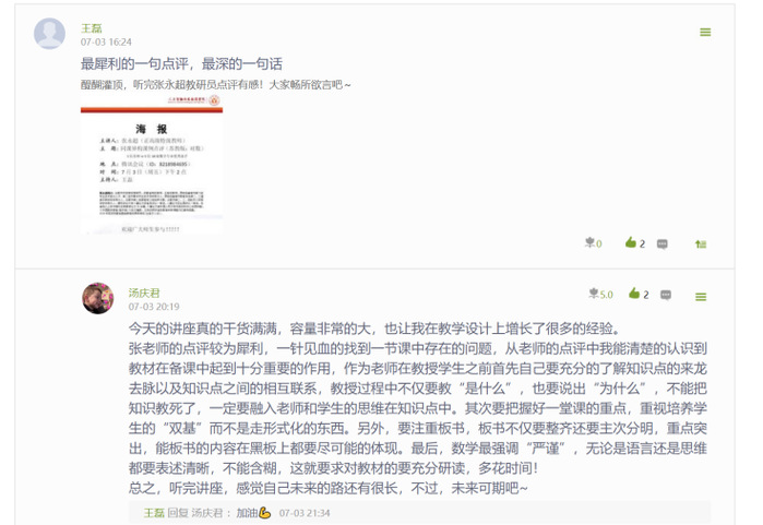 線上見習效果好不好,還得學生說了算。在7月3日合肥市教育局正高級特級教師張永超老師持續(xù)時長3個小時的關于“對數”的課題點評講座后,18數學趙強同學在學習通平臺寫下了長達1600字的感言:“首先真的很感謝有這樣一個與名師線上對面的機會,張永超老師在昨日花費了近三小時的寶貴時間給我們帶來的講座,這場探討交流課不得不用精彩去形容,如果再加一個字,那就是很精彩!聽完張老師就對數概念這堂課從而深入的數學思想、數學方法和數學精神都頗具特色,他用他獨特的視角與方式……”。
