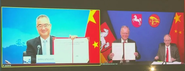 王清憲與魏爾線上簽署了《中華人民共和國安徽省人民政府與德意志聯(lián)邦共和國下薩克森州政府關(guān)于進(jìn)一步深化友好省州關(guān)系合作意向書》并互贈(zèng)禮品。