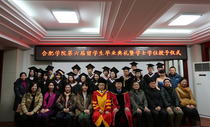 我校學(xué)位評(píng)定委員會(huì)委員、學(xué)位辦主任、副校長陳嘯宣讀合肥學(xué)院學(xué)位評(píng)定委員會(huì)“關(guān)于授予李栽星等十八位留學(xué)生學(xué)士學(xué)位的決定”,其中16人獲得文學(xué)學(xué)士學(xué)位、2人獲得工學(xué)學(xué)士學(xué)位。蔡敬民、陳嘯分別為18位留學(xué)生頒發(fā)畢業(yè)證書、學(xué)位證書和撥流蘇、合影。