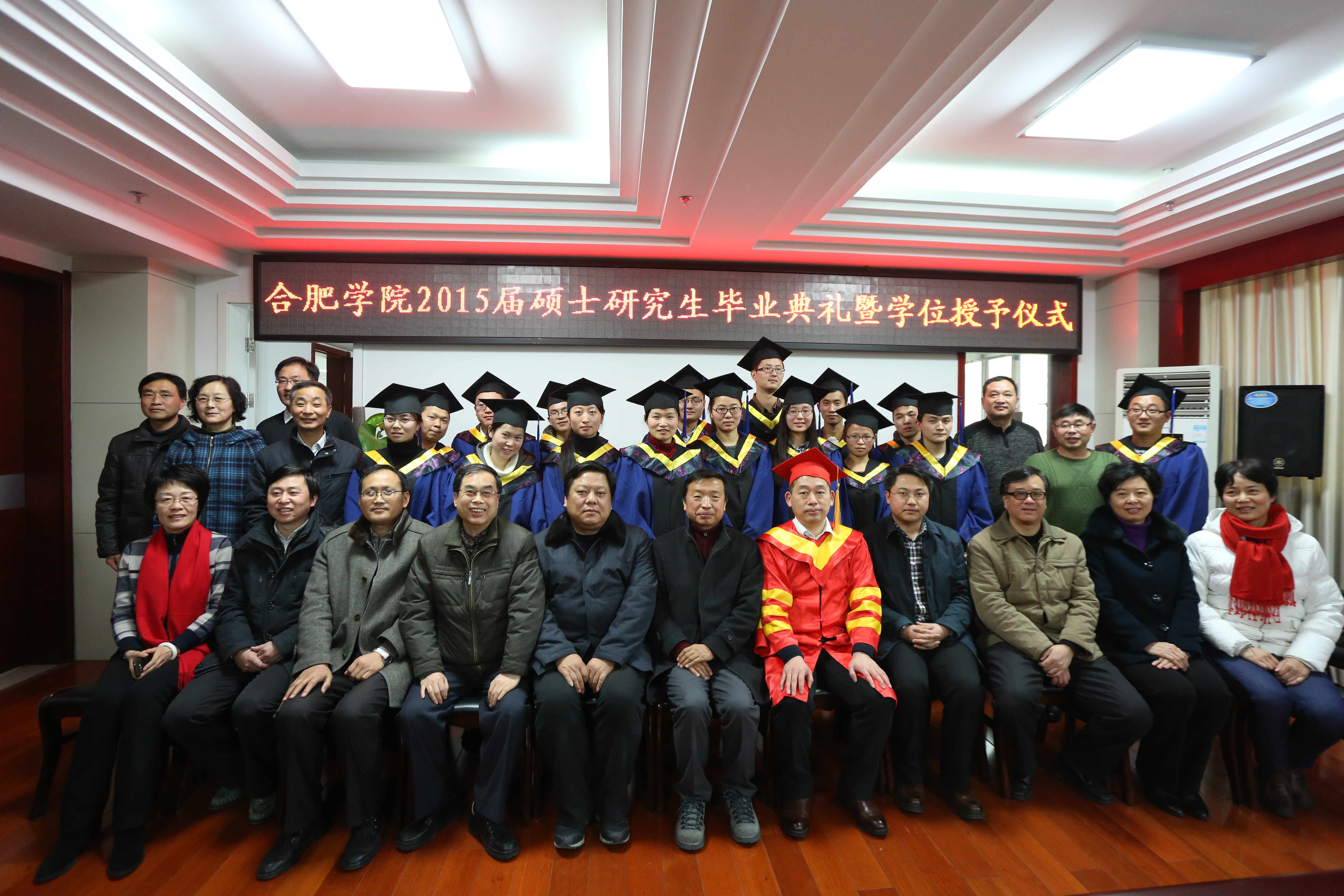 首先,我校學(xué)位評定委員會委員副主任、副校長陳嘯宣讀合肥學(xué)院學(xué)位評定委員會“關(guān)于授予2015屆環(huán)境工程專業(yè)王先琴等16名研究生工程碩士學(xué)位的決定”,副校長丁明宣讀“關(guān)于表彰合肥學(xué)院2015屆碩士研究生優(yōu)秀畢業(yè)生、優(yōu)秀畢業(yè)論文和‘安徽合大環(huán)保獎(jiǎng)學(xué)金’獲得者的決定”。隨后,校長張文兵為16位碩士研究生頒發(fā)畢業(yè)證書、學(xué)位證書和撥流蘇、合影,副校長丁明為五位“優(yōu)秀畢業(yè)生”頒發(fā)獲獎(jiǎng)證書,學(xué)生處處長董承軍和生環(huán)系主任張潔為獲得“優(yōu)秀畢業(yè)論文獎(jiǎng)”的四位同學(xué)頒發(fā)證書,安徽南風(fēng)環(huán)境工程有限公司總經(jīng)理韓厚強(qiáng)為綜合排名第一的王先琴同學(xué)頒發(fā)“安徽合大環(huán)保獎(jiǎng)學(xué)金”證書和2萬元獎(jiǎng)金,合大環(huán)境檢測有限公司總經(jīng)理韓蔚為綜合排名第二的郭鵬飛同學(xué)頒發(fā)“安徽合大環(huán)保獎(jiǎng)學(xué)金”證書和1萬元獎(jiǎng)金。
