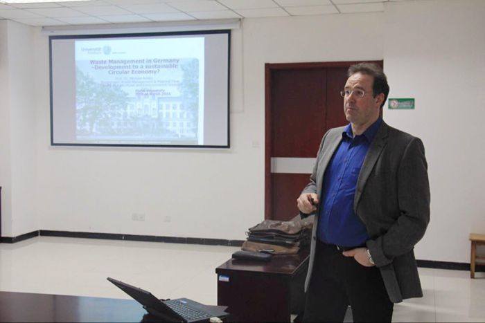 作為我校環(huán)境工程研究生專業(yè)德方教授,萊勒斯為研究生專業(yè)學(xué)生完成了廢棄物管理領(lǐng)域的相關(guān)講座,詳細(xì)介紹了德國廢棄物管理與處理領(lǐng)域相關(guān)政策、機(jī)制、技術(shù)及工程方面知識,并依據(jù)其自2002年以來與我院在華長期項(xiàng)目經(jīng)驗(yàn),就中國廢棄物處理領(lǐng)域的相關(guān)問題提出了合理建議。講座后,萊勒斯還與學(xué)生們就彼此關(guān)心的環(huán)境話題,以及我校環(huán)境工程專業(yè)研究生赴德游學(xué)和繼續(xù)攻讀博士學(xué)位等事宜進(jìn)行了介紹和交流。