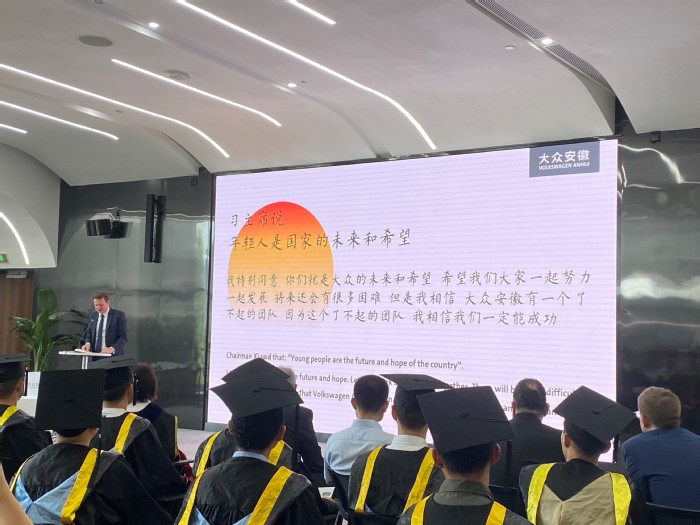 6月16日上午,我校和大眾集團合作培養(yǎng)的首批“種子工程師”順利畢業(yè),校長吳春梅出席大眾安徽舉行的畢業(yè)典禮。大眾中國執(zhí)行副總裁傅勤彥先生、大眾安徽首席執(zhí)行官葛皖鏑博士、首席制造官施耐德先生、首席技術(shù)官呂爾曼博士、首席人力資源官邵劍先生以及校長辦公室、教務處、國際交流合作處、先進制造工程學院、人工智能與大數(shù)據(jù)學院相關領導和老師共同參加畢業(yè)典禮。