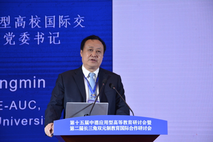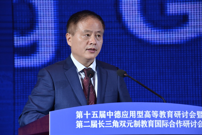 主旨報告由安徽省委教育工委委員、教育廳副廳長張庚家主持。安徽省委教育工委委員、教育廳副廳長儲常連作題為《深化“四業(yè)”融合 服務(wù)安徽創(chuàng)新發(fā)展》的報告。他表示,要搶抓新機(jī)遇,進(jìn)一步推進(jìn)學(xué)科專業(yè)與創(chuàng)新創(chuàng)業(yè)、產(chǎn)業(yè)企業(yè)、學(xué)業(yè)就業(yè)“四業(yè)”融通,圍繞產(chǎn)業(yè)發(fā)展需要不斷調(diào)整優(yōu)化學(xué)科專業(yè),圍繞創(chuàng)新創(chuàng)業(yè)建設(shè)一流學(xué)科專業(yè),圍繞學(xué)業(yè)就業(yè)深化教育教學(xué)改革,圍繞學(xué)科專業(yè)開展創(chuàng)新創(chuàng)業(yè);要下足真功夫,推進(jìn)“四業(yè)”融通落地見效,堅持科教融合,培養(yǎng)創(chuàng)新創(chuàng)業(yè)人才,促進(jìn)“產(chǎn)教城”共融,培養(yǎng)地方需要的專業(yè)人才,堅持向應(yīng)用型深度轉(zhuǎn)變,培養(yǎng)高質(zhì)量應(yīng)用型職業(yè)人才,堅持深化交流合作,培養(yǎng)國際視野的現(xiàn)代人才。他號召大家共同推動中德應(yīng)用型高校高質(zhì)量發(fā)展,為兩國、為世界高等教育的發(fā)展貢獻(xiàn)智慧和力量。