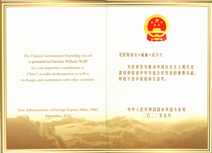 因在中德人文、教育、科技等領(lǐng)域友好合作做出卓越貢獻(xiàn),我校與同濟大學(xué)聯(lián)合推薦的克里斯蒂安·威廉·武爾夫(Christian Wilhelm Wulff)教授榮獲2022年度中國政府友誼獎, 武爾夫教授成為我校歷史上第五位獲得中國政府友誼獎的外國專家。