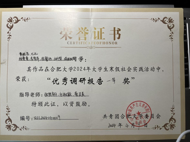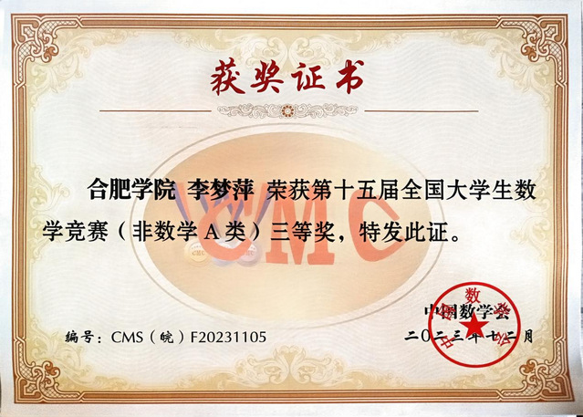 在校期間,李夢(mèng)萍同學(xué)學(xué)習(xí)成績(jī)名列前茅,2022-2023學(xué)年學(xué)分績(jī)點(diǎn)與綜合素質(zhì)均位列班級(jí)第一。曾先后獲“三好學(xué)生”、盧文慶獎(jiǎng)學(xué)金、國(guó)家獎(jiǎng)學(xué)金、國(guó)家勵(lì)志獎(jiǎng)學(xué)金、校特等獎(jiǎng)學(xué)金、校一等獎(jiǎng)學(xué)金等榮譽(yù)。學(xué)習(xí)之余,她積極參加學(xué)科競(jìng)賽與文體活動(dòng),曾獲2024年安徽省大學(xué)生國(guó)際貿(mào)易綜合技能大賽省一等獎(jiǎng)、2024年安徽省大學(xué)生創(chuàng)新大賽省銅獎(jiǎng)、2023年大學(xué)生數(shù)學(xué)競(jìng)賽省三等獎(jiǎng)等。課余時(shí)間,她也積極投身于搭建合肥大學(xué)留學(xué)生服務(wù)平臺(tái)、暑期“三下鄉(xiāng)”、寒假社會(huì)實(shí)踐活動(dòng)等。