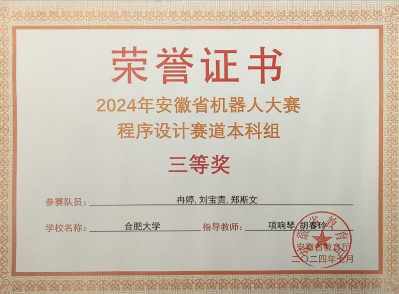 冉婷,女,漢族,出生于2004年6月,共青團(tuán)員,合肥大學(xué)人工智能與大數(shù)據(jù)學(xué)院2022級(jí)智能科學(xué)與技術(shù)專業(yè)本科生,擔(dān)任班級(jí)學(xué)習(xí)委員。曾獲校特等獎(jiǎng)學(xué)金、?!叭脤W(xué)生”、校“優(yōu)秀干部”等榮譽(yù)稱號(hào);先后獲2024年安徽省大學(xué)生創(chuàng)新大賽三等獎(jiǎng),2024年中國大學(xué)生程序設(shè)計(jì)邀請(qǐng)賽三等獎(jiǎng)等。