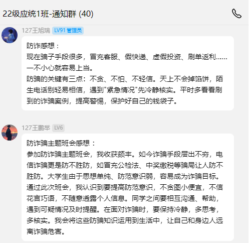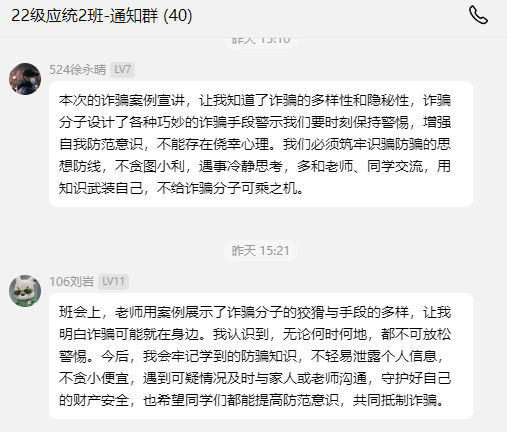 班會(huì)采用“受害者現(xiàn)身說(shuō)法”的教育形式。受騙學(xué)生以親身經(jīng)歷警示在場(chǎng)同學(xué),詳細(xì)剖析了詐騙分子的作案手法,并呼吁同學(xué)們不要輕信網(wǎng)絡(luò)誘惑,遇到可疑情況應(yīng)立即向師長(zhǎng)求證,避免財(cái)產(chǎn)損失。