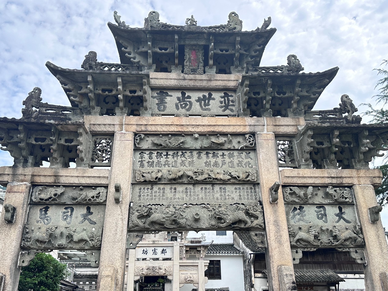 團隊成員首先參觀了龍川村的標(biāo)志性建筑——奕世尚書坊。在講解員的講述下,隊員們對這座明代石牌坊的歷史背景、建筑特色和文化內(nèi)涵有了更加深入的了解。其精巧的浮雕、鏤刻和圓雕的雕刻手法,“恩榮”匾地位之崇高,以及與之呼應(yīng)的另一塊“圣旨”匾無一不體現(xiàn)出龍川歷史地位之高,人文之雄厚。奕世尚書坊不僅展示了古代工匠的精湛技藝,也是胡氏家族輝煌歷史的象征。