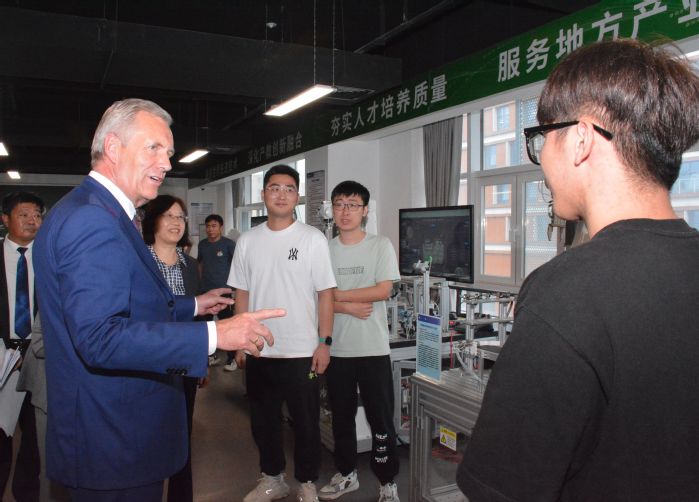 武爾夫一行還參觀了大眾學(xué)院校企實(shí)訓(xùn)平臺(tái),在多模態(tài)設(shè)備健康評(píng)估實(shí)驗(yàn)室、智能制造系統(tǒng)集成技術(shù)應(yīng)用及創(chuàng)新中心、數(shù)字孿生技術(shù)及工程應(yīng)用中心調(diào)研了學(xué)科建設(shè)、模塊化課程、實(shí)訓(xùn)教學(xué)等情況,高度肯定了我?!暗胤叫?、應(yīng)用型、國(guó)際化”的辦學(xué)定位。