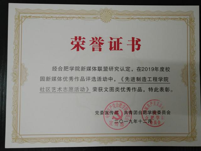 2.文化類獲獎(jiǎng)如下:合肥學(xué)院第二屆校園廉潔文化書(shū)畫攝影作品展二等獎(jiǎng)1項(xiàng),三等獎(jiǎng)10項(xiàng);合肥學(xué)院第六屆“訊飛杯”詩(shī)文朗誦比賽校內(nèi)選拔賽三等獎(jiǎng)2項(xiàng);合肥學(xué)院2019年大學(xué)生心理情景劇大賽優(yōu)秀組織獎(jiǎng),作品《青春的轉(zhuǎn)彎》獲一等獎(jiǎng),作品《撥開(kāi)云霧見(jiàn)光明》獲二等獎(jiǎng),作品《改變》獲三等獎(jiǎng);合肥學(xué)院“我和我的祖國(guó)”作品征集活動(dòng),我院作品《家國(guó)夢(mèng)是每個(gè)青年人的夢(mèng)》獲文字類優(yōu)秀獎(jiǎng),《國(guó)慶節(jié)特輯/最可愛(ài)的他》、《祖國(guó)母親,生日快樂(lè)》獲新媒體類優(yōu)秀獎(jiǎng)。先進(jìn)制造工程學(xué)院作品《先進(jìn)制造工程院社區(qū)藝術(shù)志愿活動(dòng)》在合肥學(xué)院2019年度校園新媒體優(yōu)秀作品評(píng)選活動(dòng)中榮獲文圖類優(yōu)秀作品。(主辦方:合肥學(xué)院新媒體聯(lián)盟)