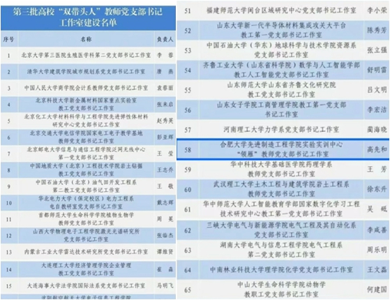 近日,教育部公布了第三批高?!半p帶頭人”教師黨支部書記工作室建設(shè)名單,合肥大學(xué)先進制造工程學(xué)院實驗實訓(xùn)中心黨支部高先和書記“領(lǐng)雁”工作室成功入選,這是學(xué)校首次入選全國高?!半p帶頭人”教師黨支部書記工作室。
