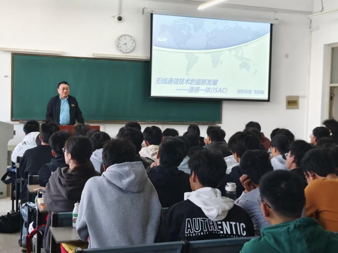 11月5日,專業(yè)邀請了合肥潤東通信科技股份有限公司毛皖敏董事長做了《無線通信技術(shù)的最新發(fā)展--通感一體(ISAC)》的專題報告。報告伊始,毛皖敏董事長介紹了其企業(yè)相關(guān)產(chǎn)品,然后,然后報告圍繞通信技術(shù)的發(fā)展、5G通信的應(yīng)用場景、通感一體無線通信和6G關(guān)鍵技術(shù)逐一展開,最后,毛總跟同學(xué)們闡述了職業(yè)發(fā)展的路徑,并對同學(xué)們四年的大學(xué)活提出了期望。