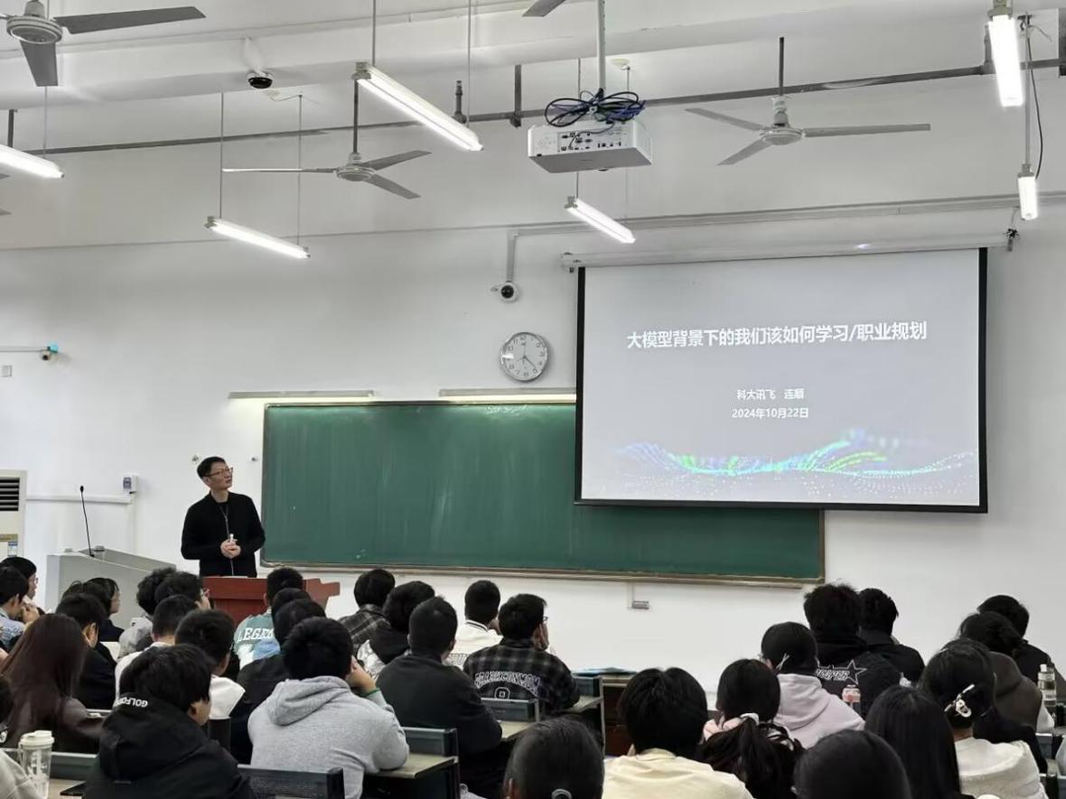10月20日,科大訊飛教育發(fā)展有限公司總監(jiān)連順做了《大模型背景下的我們該如何學(xué)習(xí)/職業(yè)規(guī)劃》的專題報告,連總首先對大模型的原理及技術(shù)進行了深入淺出的介紹,向?qū)W生展示了目前最新AI研究成果,然后介紹了前沿技術(shù)發(fā)展趨勢及行業(yè)應(yīng)用,最后對在大模型時代下學(xué)生四年的規(guī)劃提出了寶貴意見。