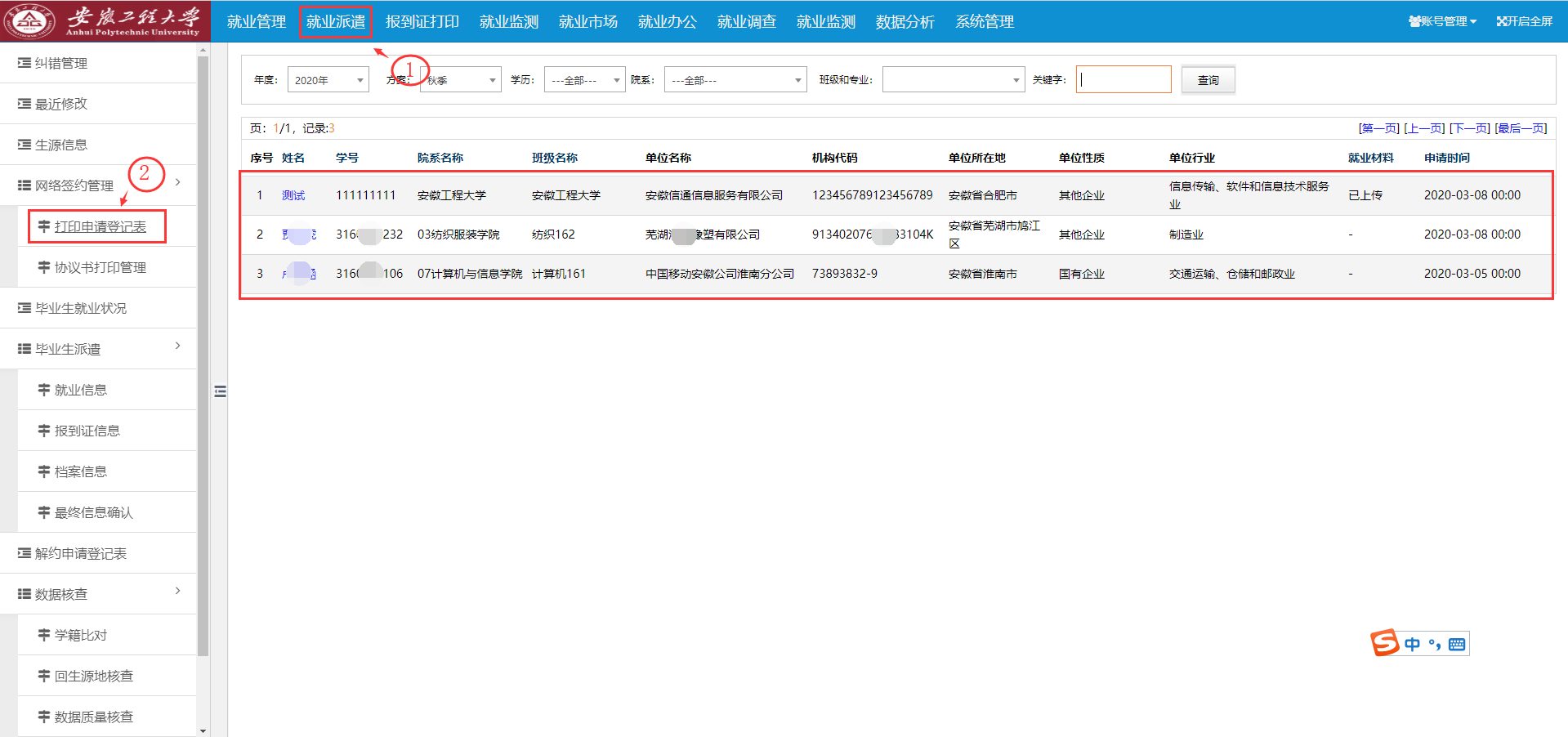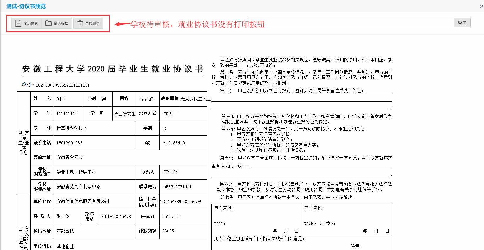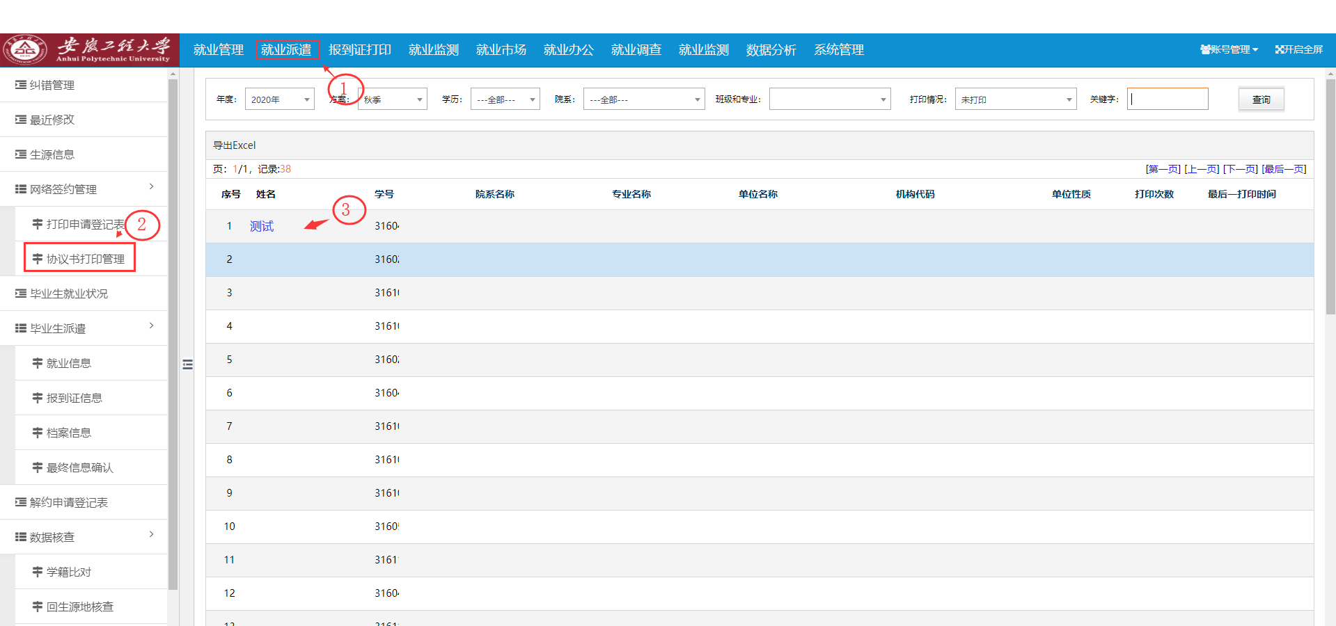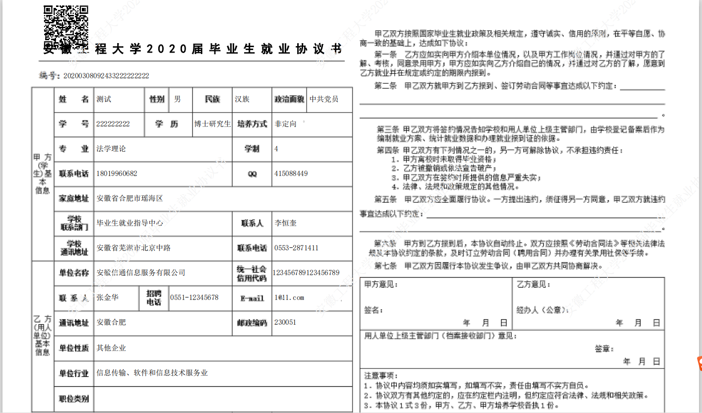 審核后的數(shù)據(jù)自動轉(zhuǎn)入“協(xié)議書打印管理”模塊,再點擊學(xué)生姓名,進(jìn)入打印頁面,即可在線打印“協(xié)議書”。 第一步、院系老師和管理員打開協(xié)議書打印管理頁面 協(xié)議書默認(rèn)打印3份(用人單位1份、畢業(yè)生1份、學(xué)校1份)。協(xié)議書打印完畢后,交給用人單位或畢業(yè)生,進(jìn)行蓋章簽字后生效。(若畢業(yè)生在外地,可自行安裝一個PDF打印機(jī),打印成PDF文件,以便進(jìn)行網(wǎng)上傳輸; 或打印出來后,掃描后傳輸)。 備注:審核通過后,用人單位亦可自行打印。 每份協(xié)議書附防偽二維碼。