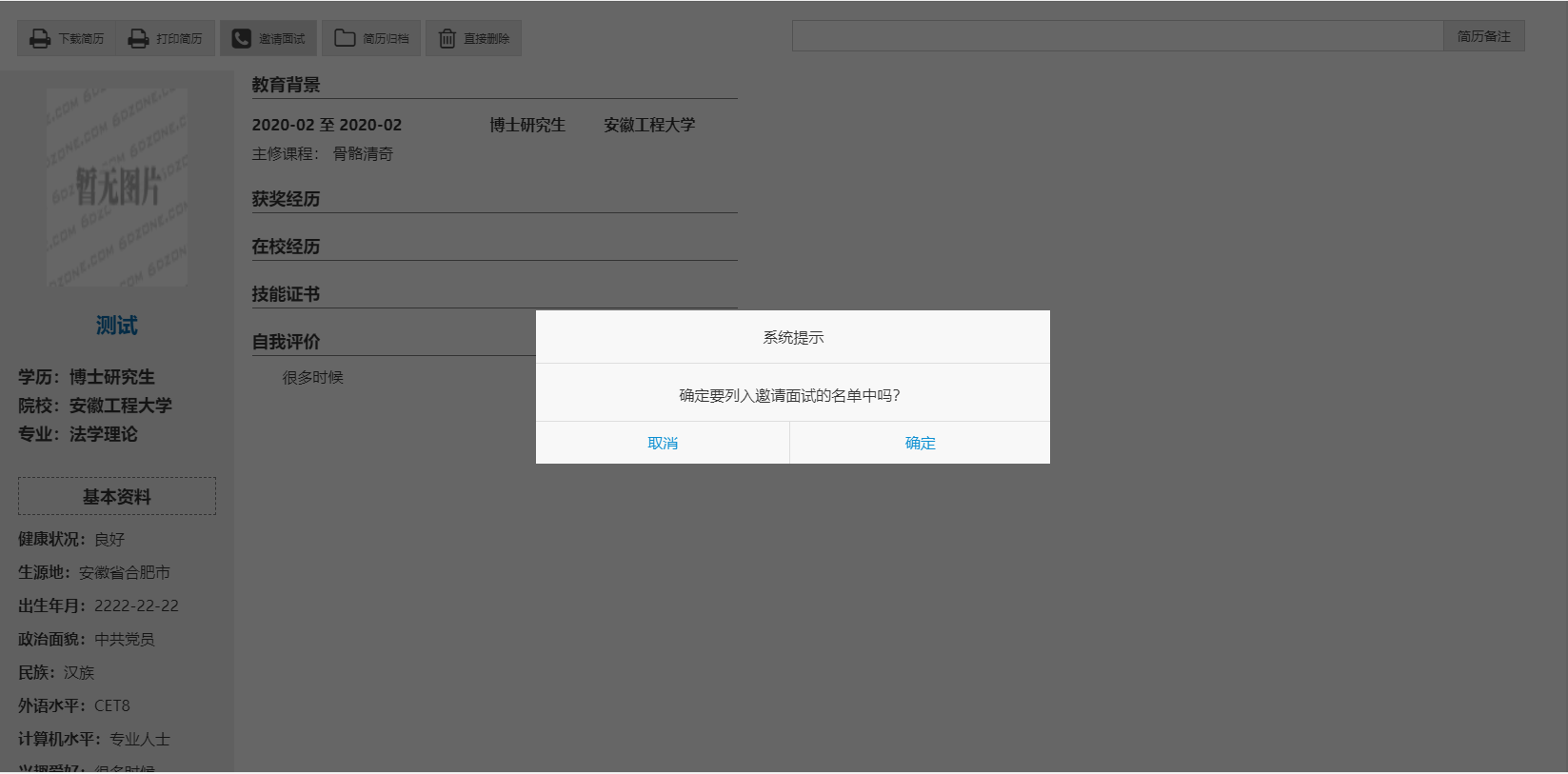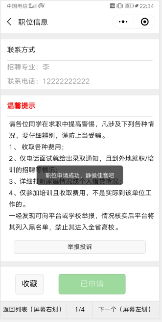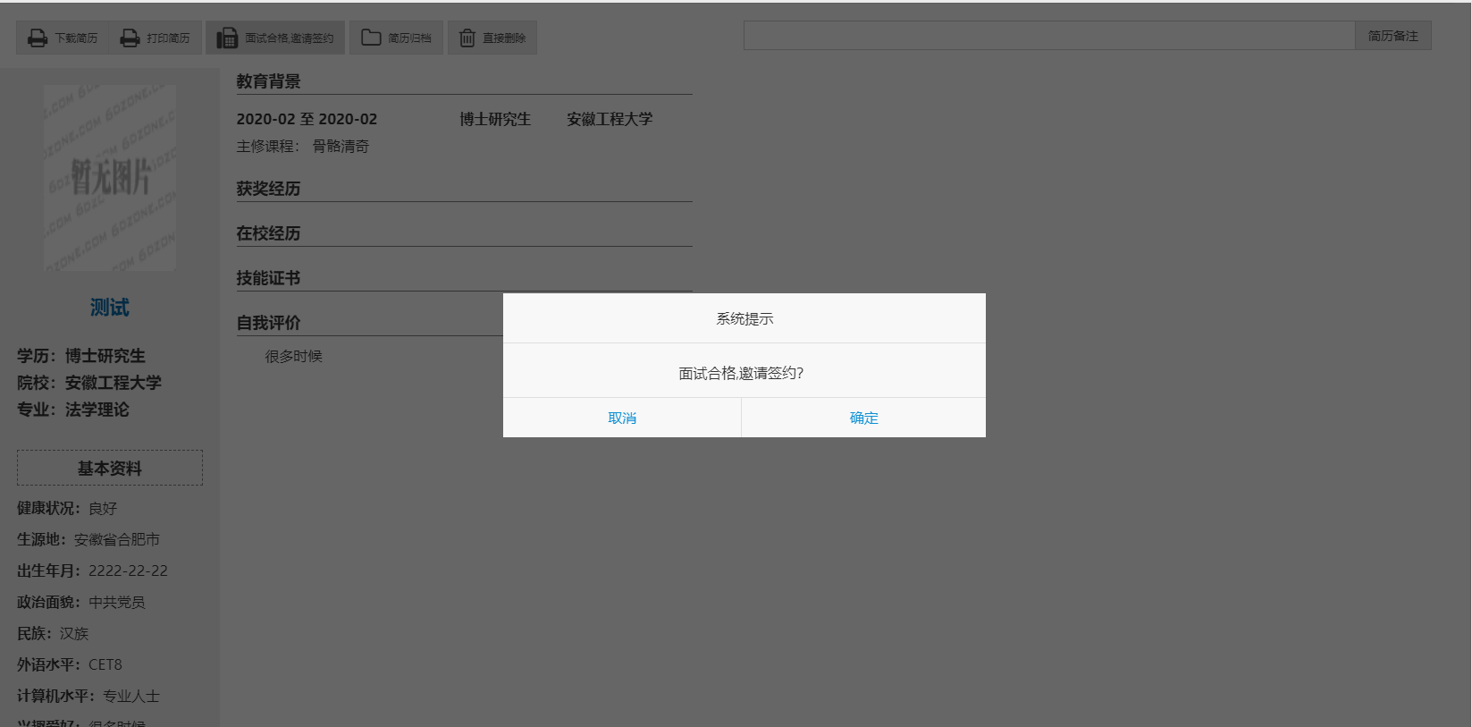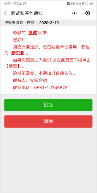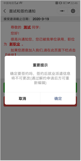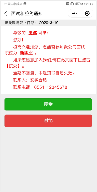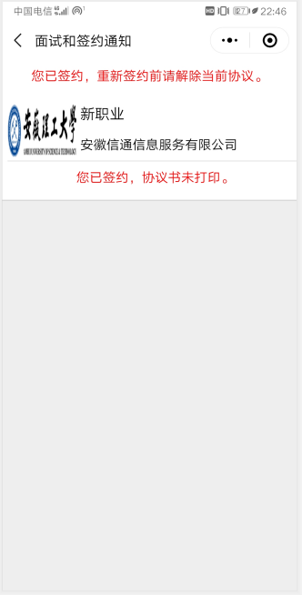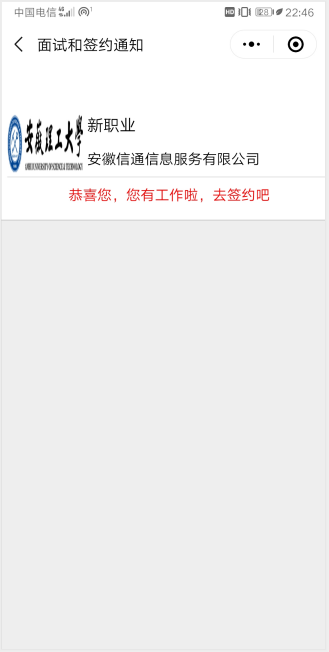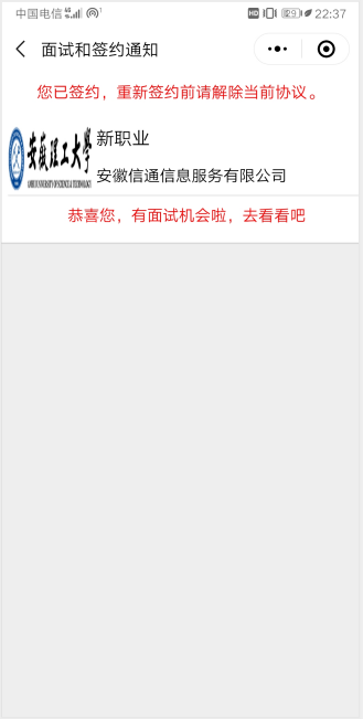 第一步、畢業(yè)生登錄小程序并完成簡歷投遞 第二步、用人單位登錄校招平臺,查看簡歷,向意向畢業(yè)生發(fā)送面試邀請。 第三步、畢業(yè)生收到面試通知,并選擇是否接受面試邀請。 第四步、用人單位登錄校招平臺,處理面試結(jié)果并決定是否簽約。 第五步、畢業(yè)生收到簽約通知,并選擇是否接受面試邀請。 簽約成功后,簽約狀態(tài)為“簽約成功,待學(xué)校審核”,就業(yè)協(xié)議書不能打印。
