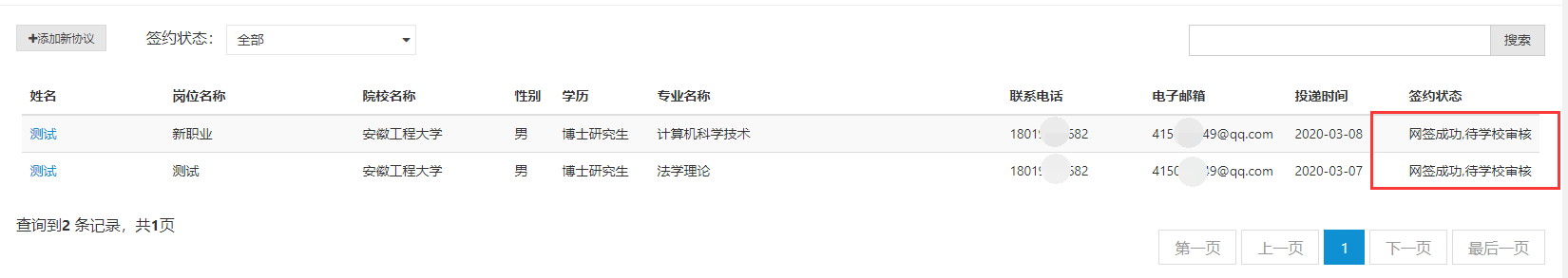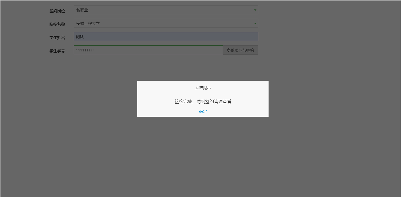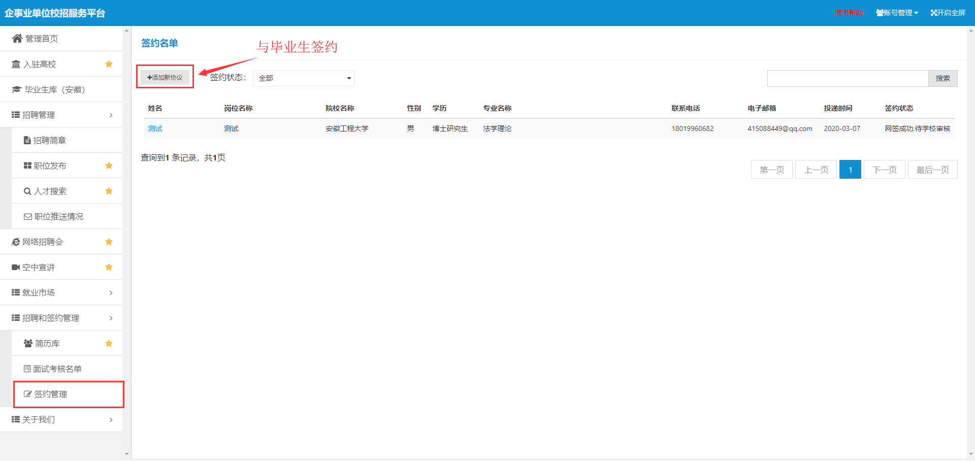 第一步、用人單位登錄校招平臺 第二步、用人單位打開簽約管理模塊 第三步、選擇簽約崗位、填寫簽約畢業(yè)生信息并確認(rèn) 簽約成功后,簽約狀態(tài)為“簽約成功,待學(xué)校審核”,就業(yè)協(xié)議書不能打印。