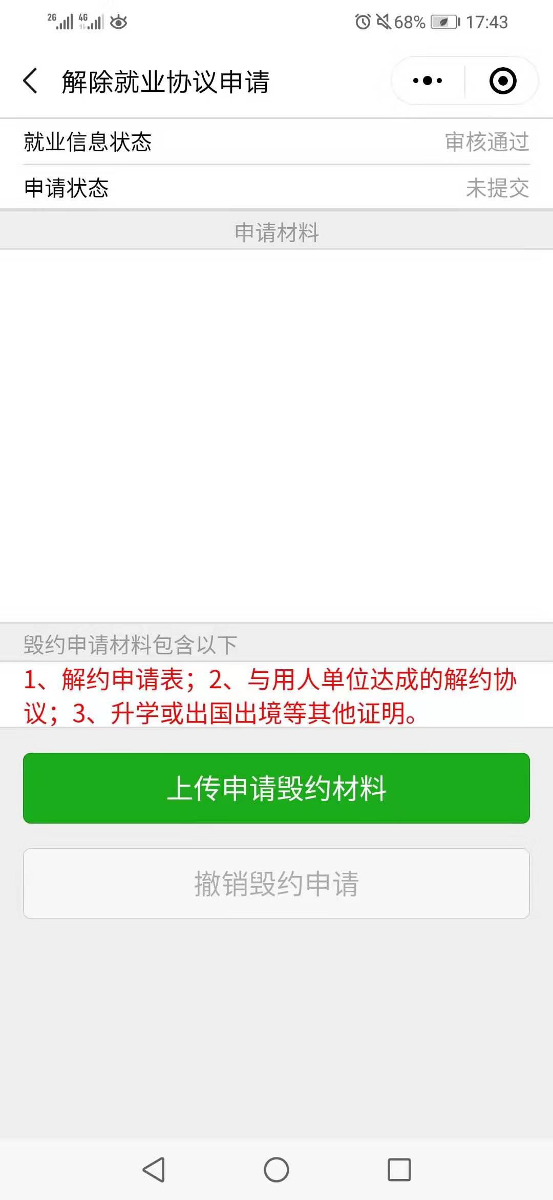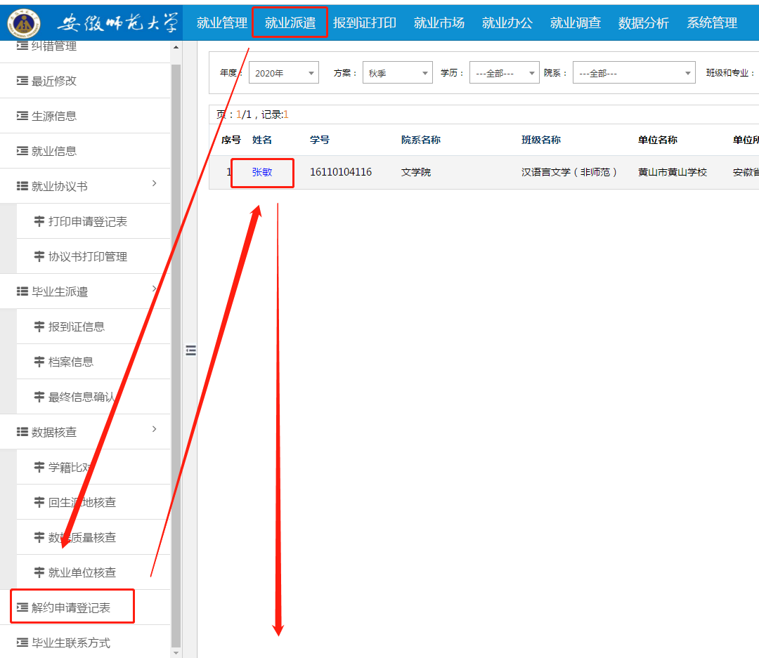 第一步、畢業(yè)生進(jìn)入微信小程序:安徽省大學(xué)生就業(yè)服務(wù)平臺,點擊“派遣”,進(jìn)入“解除就業(yè)協(xié)議申請”,上傳解約申請材料。 第二步、輔導(dǎo)員進(jìn)入系統(tǒng),點擊上方“就業(yè)派遣”,再點擊左下角“解約申請登記表”,點擊申請學(xué)生姓名,進(jìn)入審核頁,點擊“同意毀約”或“不同意毀約”即可。 解約時,應(yīng)認(rèn)真查看原協(xié)議書的內(nèi)容和提交的解約材料,對于合理的訴求應(yīng)予以堅決支持,要維護(hù)協(xié)議書的嚴(yán)肅性。 解約后,學(xué)生可重新簽約。 特別注意:網(wǎng)簽解決的是用人單位和畢業(yè)生之間簽約的問題,如果該用人單位沒有用人自主權(quán),學(xué)生需要確定好協(xié)議書上“用人單位上級主管部門”一欄是選擇去就業(yè)地人才還是回生源地: