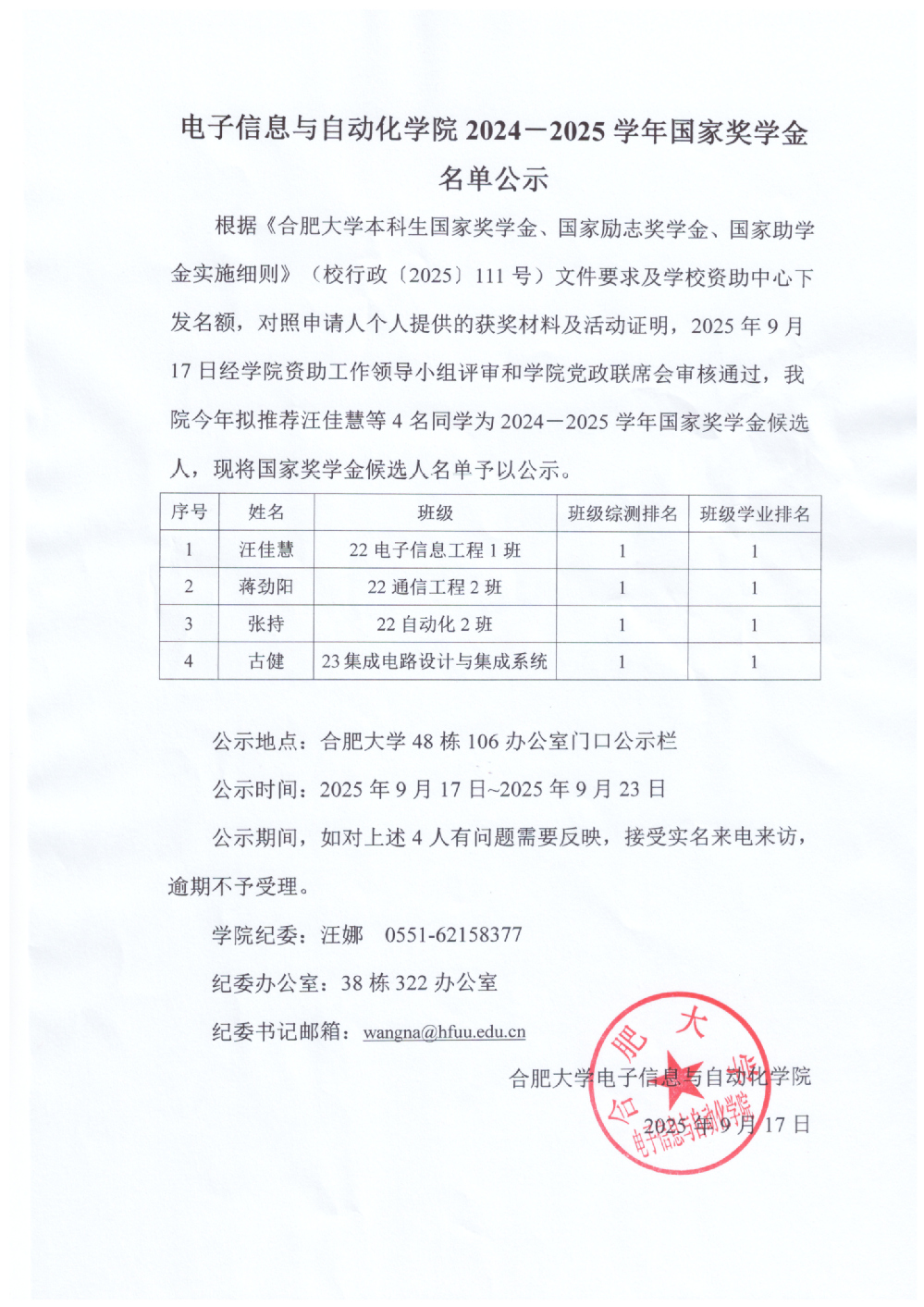 電子信息與自動化學(xué)院2024-2025學(xué)年國家獎學(xué)金名單公示