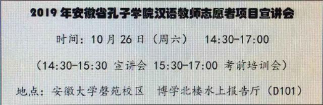 為推進安徽省各高校孔子學(xué)院工作,宣傳漢語教師志愿者項目,方便廣大學(xué)生進一步了解漢語教師志愿者的崗位要求和工作職責(zé),鼓勵更多的學(xué)生參與到漢語國際推廣事業(yè),孔子學(xué)院總部、安徽省教育廳、安徽省孔子學(xué)院師資培訓(xùn)基地和安徽大學(xué)將共同舉辦安徽省孔子學(xué)院漢語教師志愿者項目宣講會。