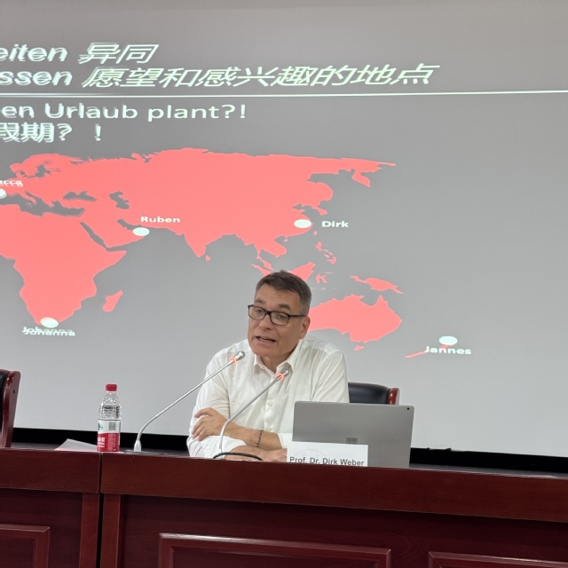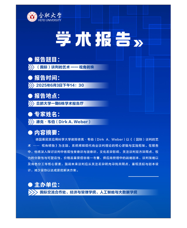 6月3日,德國慕尼黑應(yīng)用科學(xué)大學(xué)德克·韋伯(Drik A Weber)教授在一期學(xué)術(shù)報(bào)告廳為中德合作辦學(xué)專業(yè)的師生們做題為“國際談判的藝術(shù)—視角轉(zhuǎn)換”的學(xué)術(shù)報(bào)告。報(bào)告會(huì)由經(jīng)濟(jì)與管理學(xué)院吳悅副院長主持,國際交流合作處副處長孔春華、經(jīng)濟(jì)與管理學(xué)院、人工智能與大數(shù)據(jù)學(xué)院近百名師生參加報(bào)告會(huì)。