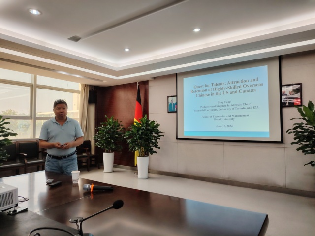 方濤教授以“Attraction and retention of highly skilled overseas Chinese in the United States and Canada”為題給經(jīng)濟與管理學院師生做一場精彩的學術報告,他結合豐富的研究數(shù)據(jù)與案例,深入剖析美加兩國吸引和留住海外華人高技能人才的策略。報告結束后,方濤與經(jīng)濟與管理學院師生、德籍教授湯衛(wèi)思進行座談,就國際人才流動趨勢、區(qū)域經(jīng)濟發(fā)展與人才政策等議題展開討論,碰撞出諸多思想火花。