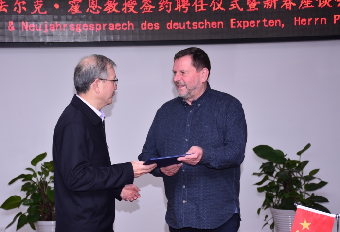 2月10日上午,我校在行政樓九樓東會(huì)議室舉辦外籍教授聘任儀式暨新春座談會(huì),來自德國(guó)漢諾威應(yīng)用科學(xué)大學(xué)的法爾克·霍恩受聘為學(xué)校外籍教授。黨委書記王其東、院長(zhǎng)吳春梅出席儀式,組織部、教務(wù)處、人事處、國(guó)際交流合作處、研究生處、設(shè)計(jì)學(xué)院、外國(guó)語學(xué)院等相關(guān)單位負(fù)責(zé)人參加儀式。王其東給霍恩教授頒發(fā)聘書,人事處處長(zhǎng)紀(jì)平代表學(xué)校與霍恩教授簽訂聘任協(xié)議。