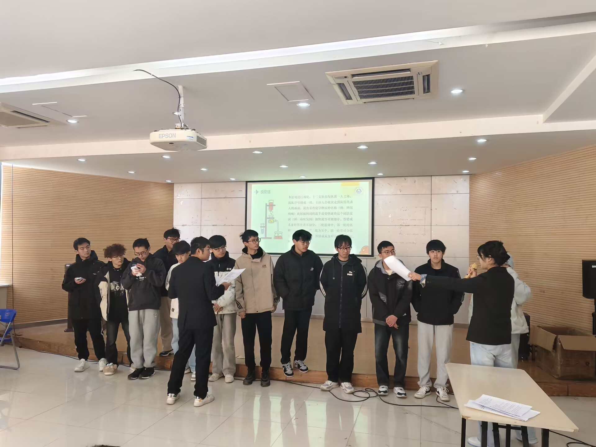 隨后的“化學(xué)謎語”環(huán)節(jié)更是將活動氛圍推向高潮。全隊成員一同參加,認(rèn)真仔細觀看相關(guān)化學(xué)內(nèi)容,同樣采用搶答的形式,根據(jù)題目要求進行化學(xué)謎語解答共六輪,答對加5分,答錯扣1分,總分?jǐn)?shù)可為負(fù)值。近十幾條精心設(shè)計的化學(xué)謎語涵蓋了化學(xué)元素、化學(xué)反應(yīng)、化學(xué)物質(zhì)特性等多方面知識,從廣為人知的“水上作業(yè)(打一化學(xué)元素)——汞”,到較為復(fù)雜的“干錘百擊出深山,烈火焚燒只等閑。粉身碎骨何所懼,要留清白在人間。(打一種化學(xué)物質(zhì))——石灰”,參與者們或獨自沉思,或三兩討論,在思索謎底的過程中,深入挖掘化學(xué)知識的奧秘。