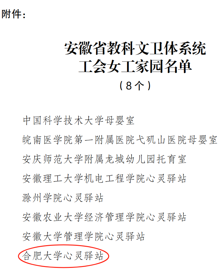 近日,安徽省教科文衛(wèi)體工會正式發(fā)布通知,命名以我院女工家園——“心靈驛站”為主體的合肥大學心靈驛站為“安徽省教科文衛(wèi)體系統(tǒng)工會女工家園”。這一殊榮標志著合肥大學能源材料與化工學院在關(guān)愛女職工、提升女職工服務(wù)質(zhì)量方面取得了顯著成效,獲得了省級層面的高度認可。此次命名是根據(jù)《關(guān)于推薦申報省教科文衛(wèi)體系統(tǒng)重點支持勞模(職工)創(chuàng)新工作室和女工家園的通知》要求,經(jīng)過基層申報、資格審查、評審公示等一系列嚴格程序后,由省教科文衛(wèi)體工會最終確定的。