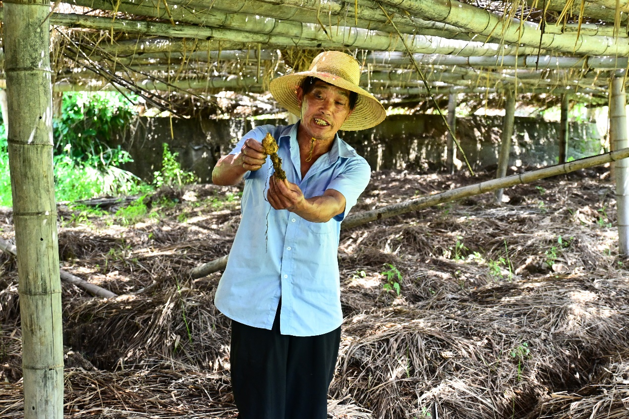 圖為村民大叔為團(tuán)隊(duì)成員展示天麻