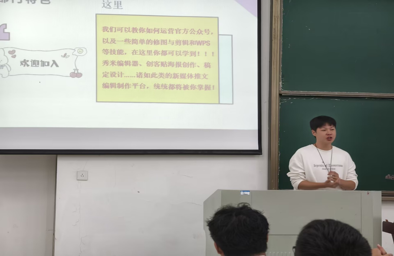 老師講解結(jié)束后,各組織依次開展招新介紹:其中新媒體中心作為校園宣傳的核心陣地,主要負(fù)責(zé)官方公眾號(hào)的日常運(yùn)營(yíng),包括內(nèi)容策劃、文案撰寫、圖文排版等工作,同時(shí)會(huì)定期組織技能培訓(xùn),幫助成員學(xué)習(xí)簡(jiǎn)單的PS圖片處理、WPS高效辦公及視頻剪輯技術(shù),無論是對(duì)新媒體運(yùn)營(yíng)感興趣,還是希望提升實(shí)用技能的學(xué)生,都能在此獲得實(shí)踐與成長(zhǎng);文體部聚焦校園文化與體育活動(dòng)開展,不僅會(huì)策劃組織運(yùn)動(dòng)會(huì)、文藝晚會(huì)、歌唱比賽、啦啦操比賽、綠模大賽等各類活動(dòng),還會(huì)選拔學(xué)生參與校內(nèi)外文藝賽事,成員若在比賽中獲獎(jiǎng),可按照學(xué)校規(guī)定獲得綜測(cè)加分,既能豐富課余生活、展現(xiàn)個(gè)人特長(zhǎng),也能為學(xué)業(yè)發(fā)展助力。