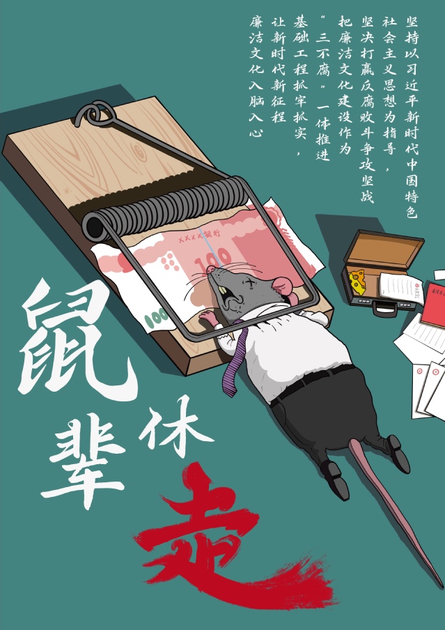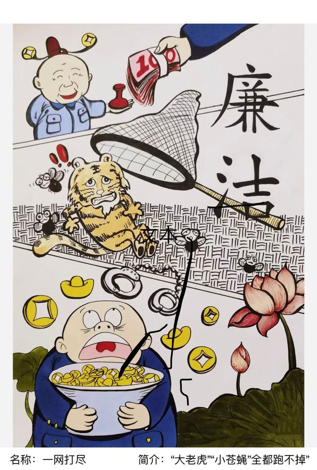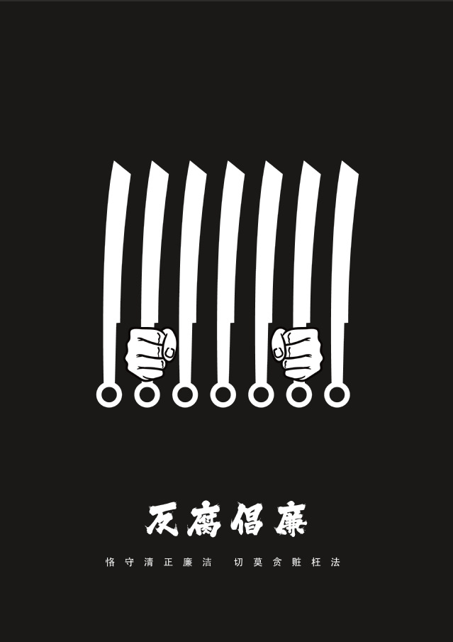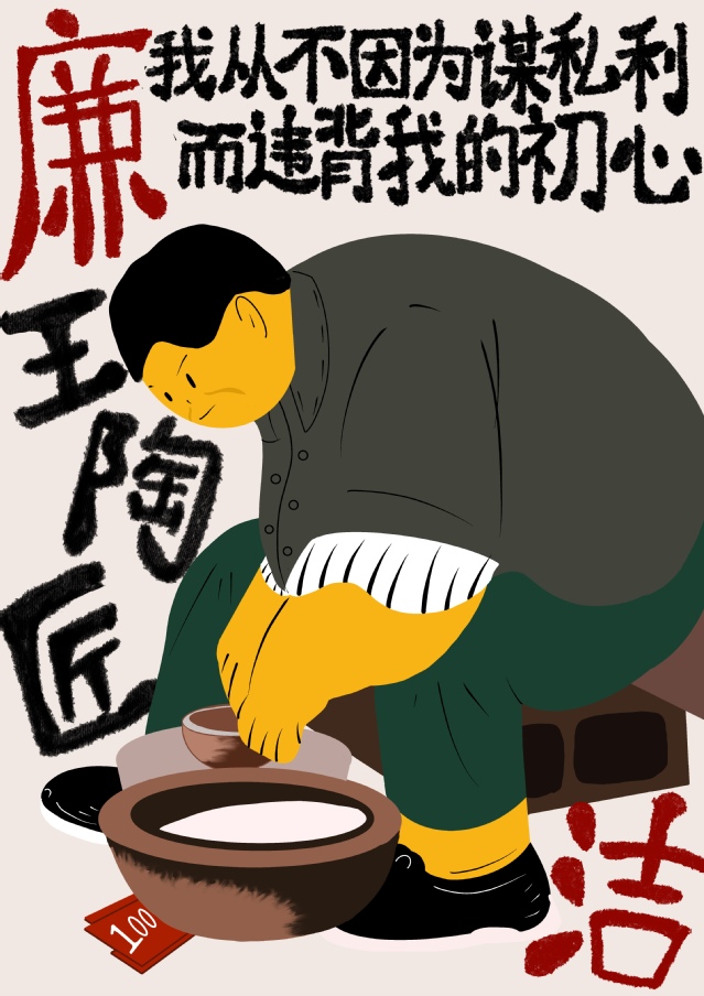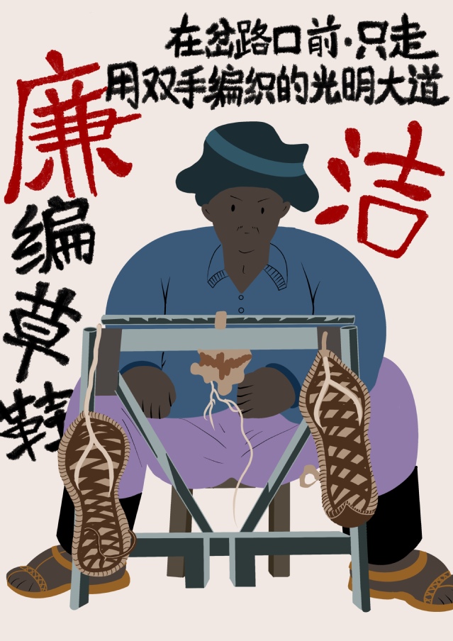 作品圍繞“反腐廉潔”進行創(chuàng)作,運用了三位手工藝人的形象對貪污腐敗的人進行反諷;將腐敗不正之風的人不會有的生活方式直接寫了出來,同時使用扁平畫的風格將生活中最樸素人物的真實的狀態(tài)表現(xiàn)出來,字體偏手寫風格,充滿親和力,“廉潔”兩字使用紅色更加突出。