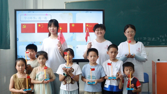 7月7日下午,合肥大學(xué)教育學(xué)院“同筑鄉(xiāng)村夢,共‘育’振興果”志愿服務(wù)隊(duì)在合肥市小廟鎮(zhèn)蜀山行知學(xué)校開展了暑期“三下鄉(xiāng)”社會實(shí)踐活動。教師黃秋語給孩子們帶來一堂理論與實(shí)踐相結(jié)合的愛國主義教育課,讓孩子們認(rèn)識我國不同種類的旗幟并了解它們背后的故事。 “五星紅旗上,大的黃色五角星象征著黨,四個小的五角星緊緊環(huán)繞在大的五角星周圍,象征著人民,寓意人民緊密地團(tuán)結(jié)在黨的周圍。”孩子們坐的端正,聽教師講述國旗、團(tuán)旗以及隊(duì)旗的含義和由來。新中國的成立離不開革命先輩們的艱苦奮斗,每一面鮮紅的旗幟背后都有著無數(shù)可歌可泣的故事。一段開國大典現(xiàn)場的視頻帶著孩子們進(jìn)入往昔的場景,將課堂的氣氛推向高潮,五星紅旗緩緩升至旗桿頂端,視頻中的人們發(fā)出陣陣喝彩,孩子們也感到心潮澎湃,不禁激動地鼓起掌來。 升旗儀式是對青少年進(jìn)行愛國主義教育的重要途徑,為促進(jìn)理論與實(shí)踐相結(jié)合,教師與孩子們共同制作國旗升降臺手工模型。孩子們在教師和助教的幫助下,聚精會神地用雙手認(rèn)真地拼湊著每一個零件,最終完成了一個個承載著孩子們對祖國美好祝愿的國旗升降臺。在恢弘的國歌聲中,“小旗手們”神情肅穆地升起了自己的五星紅旗,注視著它們?nèi)饺缴?,自豪感油然而生,愛我中華的種子悄然埋入孩子們的心中。 愛國主義教育有助于增強(qiáng)孩子們的國家認(rèn)同感和歸屬感,塑造正確的價值觀,為孩子們未來人生道路的選擇指明方向。教師將愛國主義教育與組裝國旗升降臺手工模型相結(jié)合,讓愛國主義與實(shí)踐精神相結(jié)合,讓紅色文化的甘露浸潤孩子們的心田。通過本節(jié)課的學(xué)習(xí),孩子們深刻地意識到,要時刻銘記自己少先隊(duì)員的身份,讓愛黨愛國情懷厚植在日常生活中,落實(shí)在具體行動里,做有理想、敢擔(dān)當(dāng)?shù)臅r代新人。(教育學(xué)院撰稿:魯?shù)つ?初審:張弦樂 復(fù)審:王迅 終審:劉良宏) |