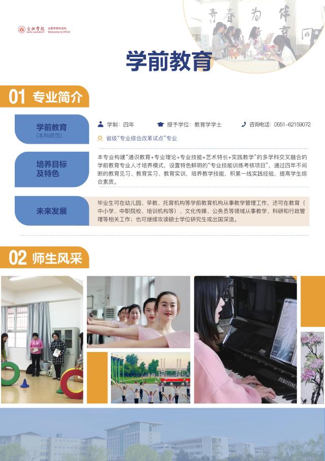 學前教育(本科 師范) 咨詢電話:0551-62159072 省級“專業(yè)綜合改革試點”專業(yè) 學制:四年 授予學位:教育學學士 培養(yǎng)目標及特色:本專業(yè)構建“通識教育+專業(yè)理論+專業(yè)技能+藝術特長+實踐教學”的多學科交叉融合的學前教育專業(yè)人才培養(yǎng)模式,設置特色鮮明的“專業(yè)技能訓練考核項目”,通過四年不間斷的教育見習、教育實習、教育實訓,培養(yǎng)教學技能,積累一線實踐經驗,提高學生綜合素質。 畢業(yè)生發(fā)展方向:畢業(yè)生可在幼兒園、早教、托育機構等學前教育機構從事教學管理工作,還可在教育(中小學、中職院校、培訓機構等)、文化傳媒、公務員等領域從事教學、科研和行政管理等相關工作;也可繼續(xù)攻讀碩士學位研究生或出國深造。 |