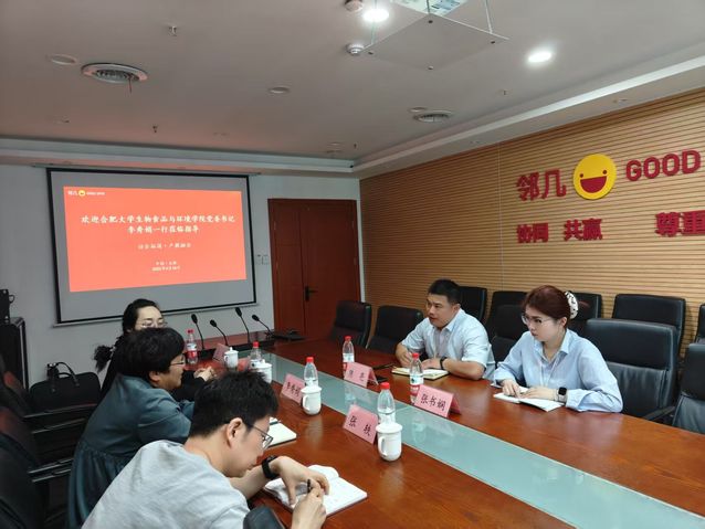 隨后,陳部長邀請李書記一行來到鄰幾公司總部進行座談,同時邀請了合肥大學(xué)23屆畢業(yè)生張書嫻參加座談會、與母校老師進行交流。陳部長首先介紹了安徽鄰幾便利店公司的創(chuàng)立和發(fā)展情況,生物學(xué)院一行分別介紹了學(xué)院、專業(yè)和師資等情況。陳部長談到,鄰幾公司物流中心、烘焙生產(chǎn)線、快餐生產(chǎn)線等都將于近期投產(chǎn),門店也在快速擴張中,亟需大量新鮮血液投入公司的快速發(fā)展建設(shè)中。陳部長還依次介紹了目前在職的十幾位合肥大學(xué)畢業(yè)生的工作情況,對合大校友的專業(yè)水平、綜合能力、敬業(yè)態(tài)度給予了高度評價。雙方就下一步可能開展的企業(yè)命題學(xué)科競賽、招聘用人等產(chǎn)學(xué)研工作進行了充分溝通。