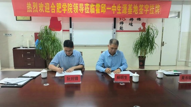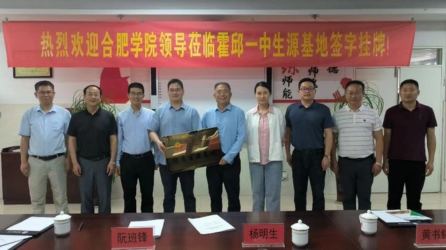 座談會(huì)后,雙方舉行了合肥學(xué)院和毛坦廠(chǎng)中學(xué)東城校區(qū)“優(yōu)質(zhì)生源基地”授牌儀式。在霍邱縣第一中學(xué),黨委書(shū)記、校長(zhǎng)楊明生,副校長(zhǎng)王德寶、許正田等校領(lǐng)導(dǎo)首先帶領(lǐng)宣傳小組參觀(guān)了霍邱一中校園及周邊環(huán)境。隨后,在霍邱一中名師工作室雙方簽訂了戰(zhàn)略合作協(xié)議,舉行了合肥學(xué)院“優(yōu)質(zhì)生源基地”授牌儀式。在儀式上,楊明生校長(zhǎng)介紹了霍邱一中近年來(lái)的辦學(xué)情況、校園文化建設(shè)和教育教學(xué)改革情況;阮班鋒院長(zhǎng)介紹了合肥學(xué)院的辦校歷史和辦學(xué)特色,陳俊院長(zhǎng)介紹了生物食品與環(huán)境學(xué)院的專(zhuān)業(yè)設(shè)置和學(xué)科特點(diǎn)等情況,希望未來(lái)有更多的霍邱一中優(yōu)秀學(xué)子進(jìn)入合肥學(xué)院深造。雙方都表達(dá)了加強(qiáng)溝通交流與友好合作的意愿。