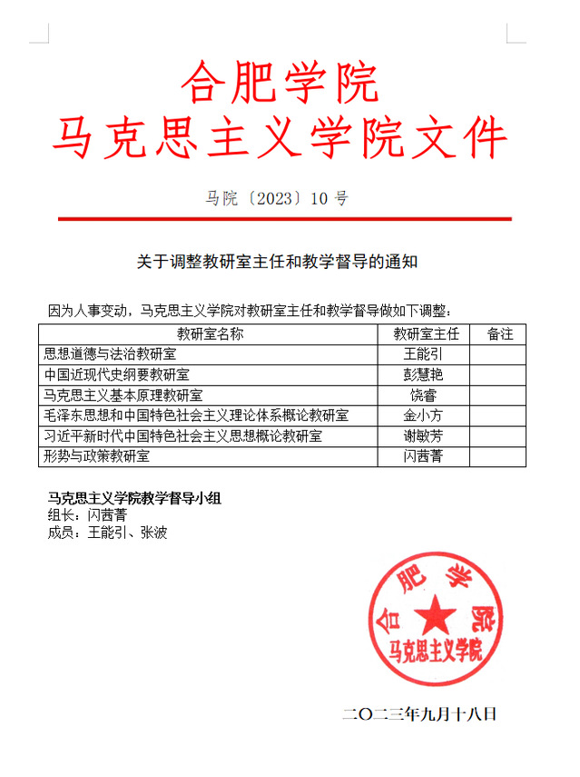 關于調整教研室主任和教學督導的通知(馬院〔2023〕10號).doc
