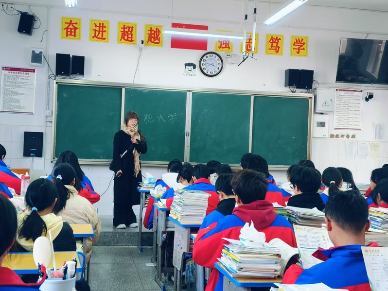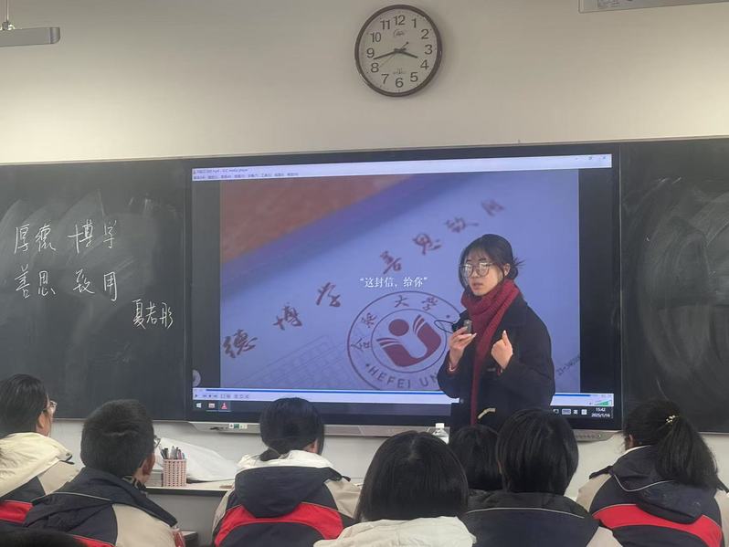 本次活動(dòng)涉及合肥一中、合肥六中、合肥168中學(xué)等省內(nèi)外28所中學(xué),影響了近千位高中學(xué)生。來(lái)自24級(jí)新聞1班的夏若彤返回母校阜陽(yáng)紅星中學(xué),她以介紹合肥大學(xué)的特色與優(yōu)勢(shì)為核心,向同學(xué)們展示了大學(xué)生活的魅力,詳細(xì)講解了學(xué)校的專業(yè)設(shè)置和課程安排,特別是一些特色專業(yè)和同學(xué)們感興趣的熱門專業(yè)。同時(shí)還分享了豐富多彩的校園活動(dòng),包括社團(tuán)、體育賽事、學(xué)科競(jìng)賽和志愿服務(wù)等內(nèi)容,展現(xiàn)了大學(xué)生活的多元化。在宣講過(guò)程中,夏若彤積極與高中生們積極互動(dòng),耐心回答他們提出的關(guān)于大學(xué)生活、學(xué)習(xí)規(guī)劃等方面的問(wèn)題,并結(jié)合自身經(jīng)歷分享了經(jīng)驗(yàn)。
