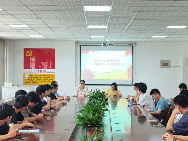 為鼓勵(lì)廣大青年學(xué)子響應(yīng)國家號(hào)召,激發(fā)參軍報(bào)國熱情,2025年5月21日下午,語言文化與傳媒學(xué)院在5棟202會(huì)議室舉辦了參軍入伍政策宣講會(huì)。會(huì)議邀請(qǐng)到學(xué)校武裝部鄭國平老師擔(dān)任主講人。學(xué)院輔導(dǎo)員魏舒荍、柳守志、陳偉及高年級(jí)全體男生參加了會(huì)議。
