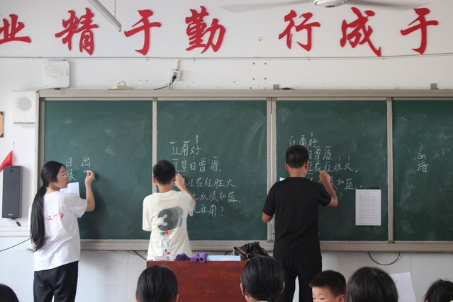 教學(xué)組將專業(yè)所學(xué)轉(zhuǎn)化為通俗易懂的課程內(nèi)容,通過古詩吟誦激活鄉(xiāng)村文化課堂,既強(qiáng)化了青少年的文化自信,也以實(shí)際行動踐行了語言文化與傳媒學(xué)院學(xué)子服務(wù)鄉(xiāng)村振興的責(zé)任擔(dān)當(dāng)。瑯瑯吟誦聲回蕩在盛夏的校園,為石板沖鄉(xiāng)的孩子們播下了一顆傳承千年詩心的種子。