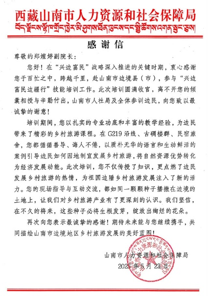 鄭嬗婷副院長作為安徽省人社廳組織的文旅專家,跨越千里,遠(yuǎn)赴西藏,參加了歷時(shí)七天的“興邊富民邊疆行”活動(dòng),克服高原反應(yīng)深入鄉(xiāng)鎮(zhèn)一線,通過現(xiàn)場指導(dǎo)、專業(yè)授課等方式為邊民傳授鄉(xiāng)村旅游經(jīng)營管理知識(shí),獲山南市人社局致信感謝。黨員教師張業(yè)臣、王汝幸?guī)ьI(lǐng)支部教師和學(xué)生赴銅陵市義安區(qū)開展調(diào)研,承擔(dān)該區(qū)旅游資源普查、“十五五”文化和旅游發(fā)展規(guī)劃編制服務(wù)項(xiàng)目;并在義安區(qū)文化旅游局開展培訓(xùn),指導(dǎo)當(dāng)?shù)芈糜钨Y源的開發(fā)與利用。