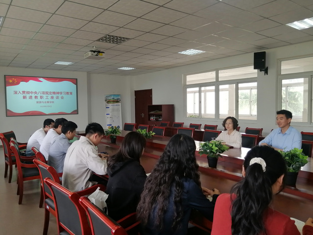 5月6日,旅游與會展學(xué)院召開深入貫徹中央八項規(guī)定精神學(xué)習(xí)教育新進(jìn)教職工座談會。學(xué)院黨委書記黃雄英,黨委副書記孫靜宇出席。學(xué)院近兩年新進(jìn)教職工參加會議,孫靜宇主持會議。