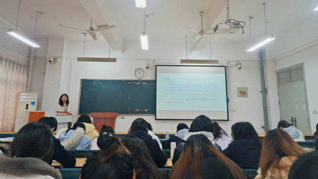 大會(huì)中,殷明明老師首先向大家介紹了畢業(yè)論文撰寫的整個(gè)流程,包括選定指導(dǎo)老師,確定選題,提交開題報(bào)告,復(fù)審,抽查以及答辯等步驟。然后,殷明明老師給大家講解了一些細(xì)節(jié),比如查重比重、送至外審的比例等,要求大家誠(chéng)信寫作。之后,殷明明老師向大家強(qiáng)調(diào)了畢業(yè)實(shí)習(xí)的要求和紀(jì)律。